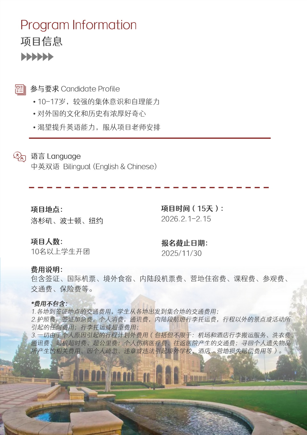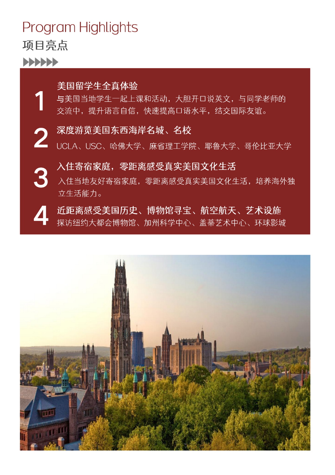 【推荐理由】与美国伴学一起走进加州中小学,全真体验美国课堂场景。畅游洛杉矶、波士顿、纽约;参访UCLA、USC、哈佛大学、麻省理工学院、 耶鲁大学、哥伦比亚大学。