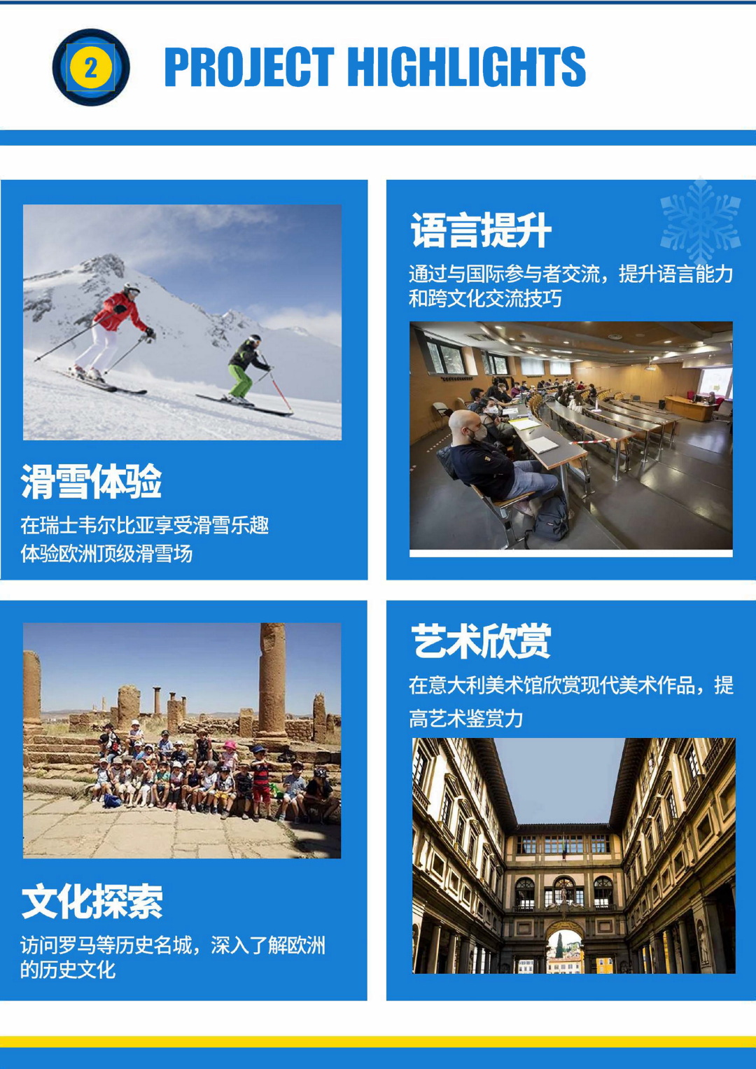 【推荐理由】这是北欧的冬季,我们在瑞士上午参加语言课程,下午体验滑雪课程,通过晚间城市参观和活动如瑞士之夜、烹钰之夜等,让学生在语言学习的同时,了解和体验瑞士文化 ,将语言知识应用到实际交流中。期间,还将访问罗马、蒙特利尔、意大利米兰等历史名城。