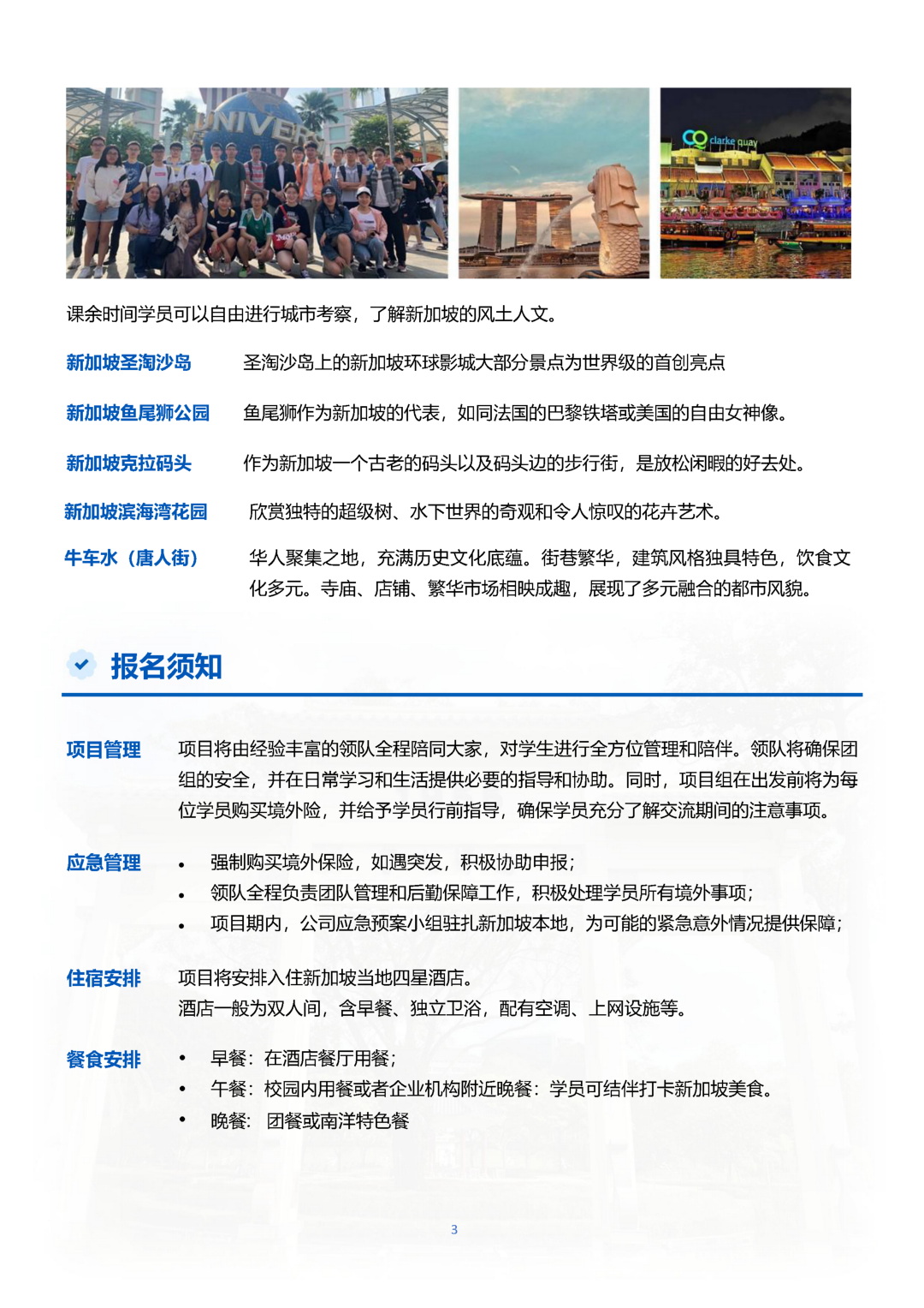 【推荐理由】本次国际金融菁英培养项目,从新加坡自身金融及经济现状出发,延伸至世界经济贸易,带领学生提升商业金融管理思维,以及商业分析实操能力。期间会组织参访不同机构,让学生深度了解新加坡的政治、经济、文化等方面内容,丰富学生海外阅历,颁发项目结业证书。