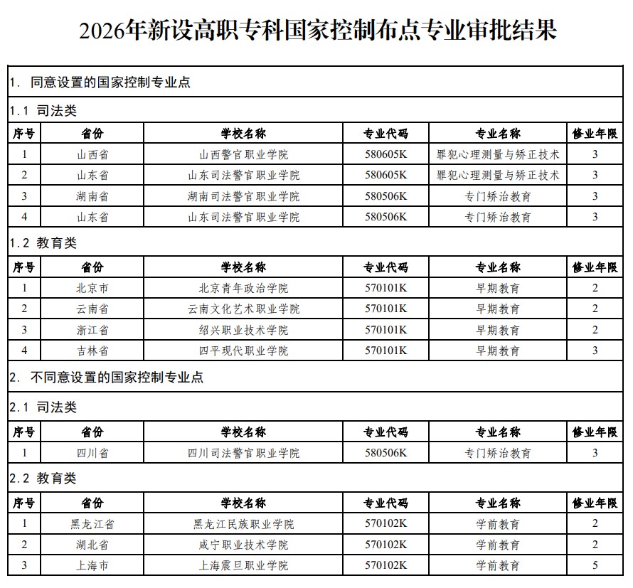 教育部关于公布2026年高等职业教育 专科专业设置备案和审批结果的通知