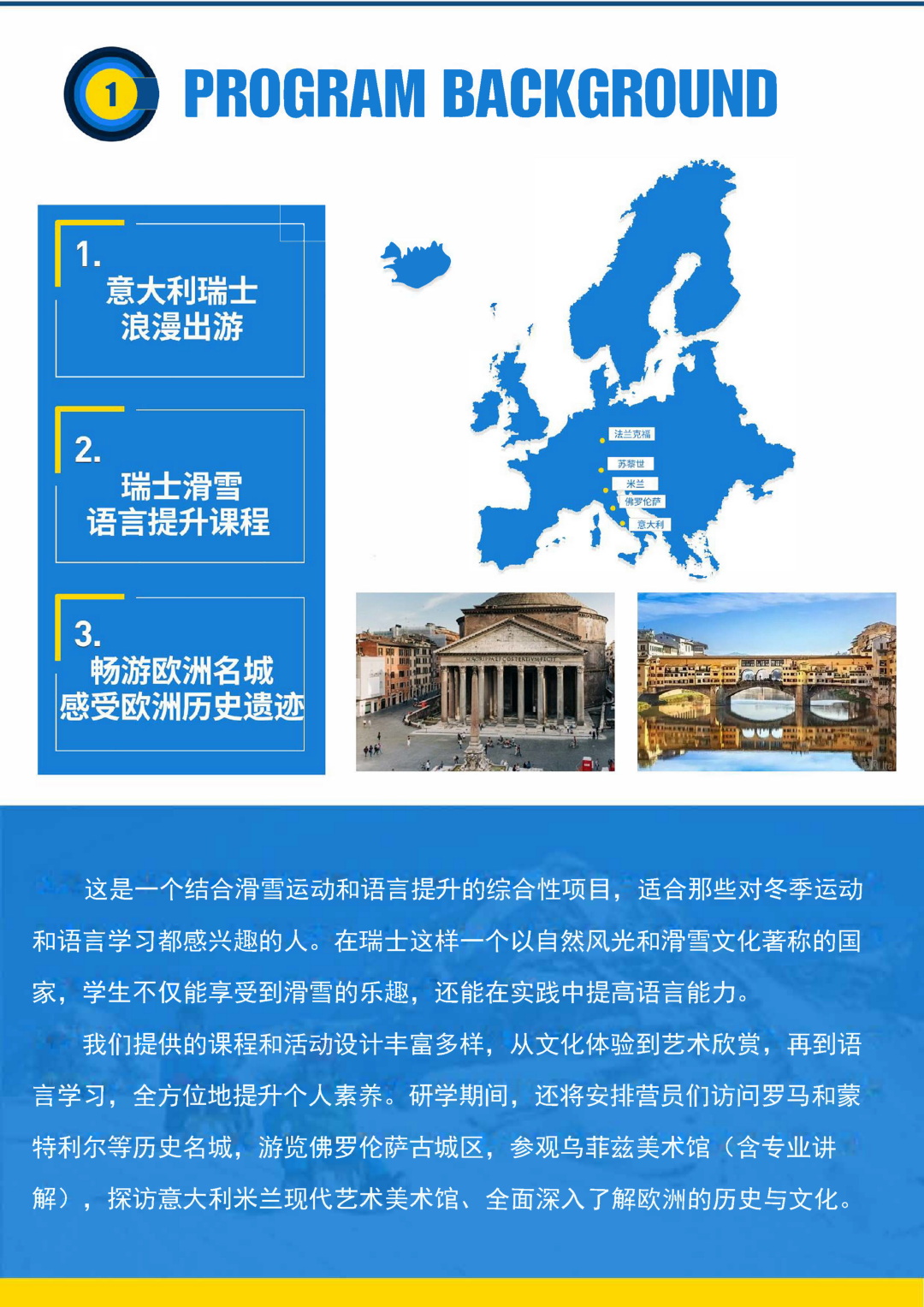 【推荐理由】这是北欧的冬季,我们在瑞士上午参加语言课程,下午体验滑雪课程,通过晚间城市参观和活动如瑞士之夜、烹钰之夜等,让学生在语言学习的同时,了解和体验瑞士文化 ,将语言知识应用到实际交流中。期间,还将访问罗马、蒙特利尔、意大利米兰等历史名城。