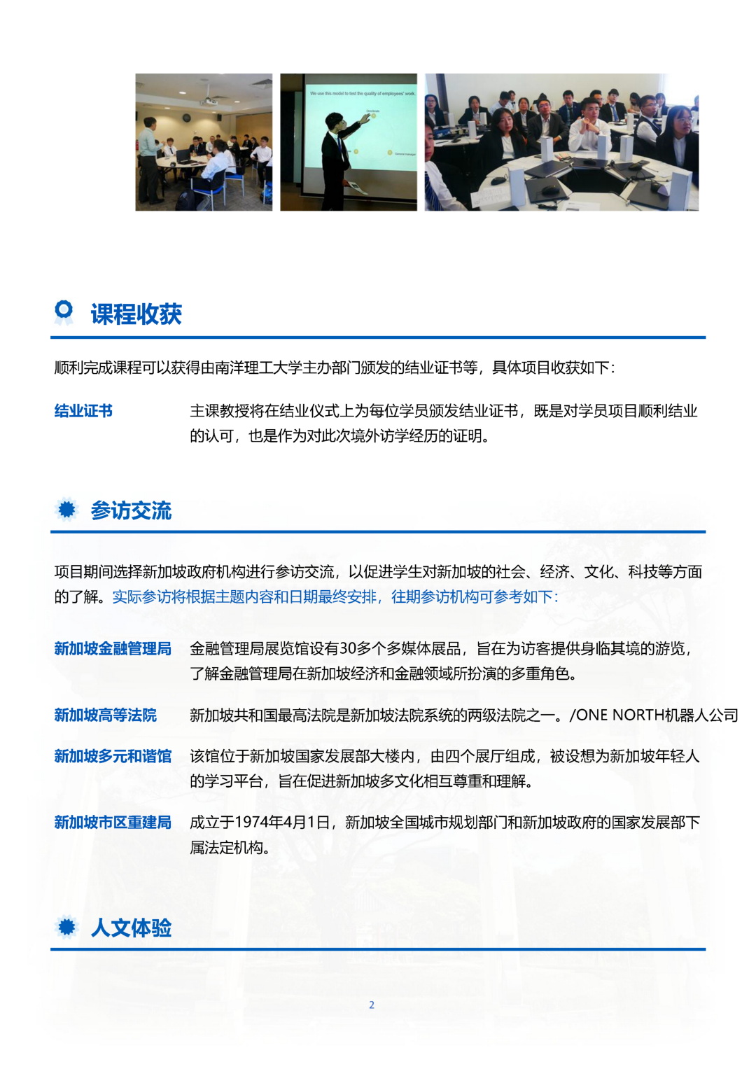 【推荐理由】本次国际金融菁英培养项目,从新加坡自身金融及经济现状出发,延伸至世界经济贸易,带领学生提升商业金融管理思维,以及商业分析实操能力。期间会组织参访不同机构,让学生深度了解新加坡的政治、经济、文化等方面内容,丰富学生海外阅历,颁发项目结业证书。